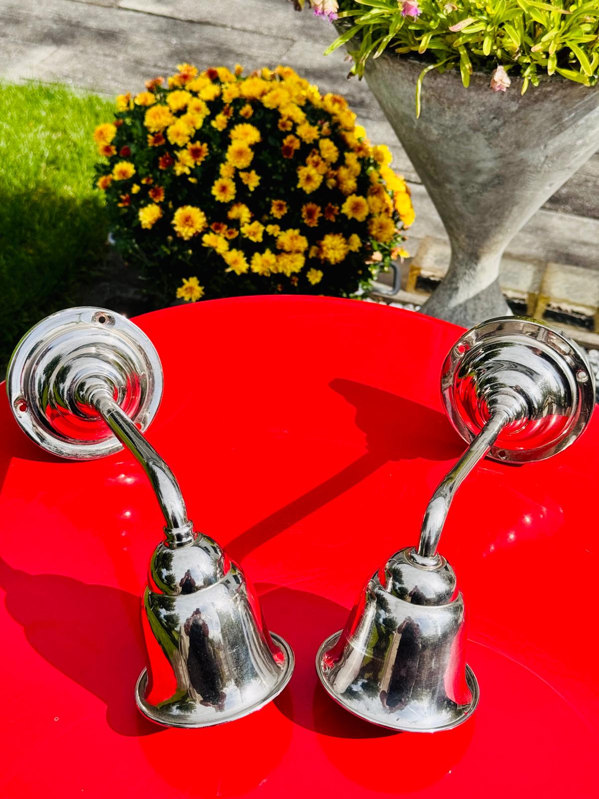 Design Paar modernistische Appliquen Nickel um 1920/1930. Formschöne und elegante Nickel Appliquen aus den 20er Jahren, trompeten- oder blumenfürmig, mit Porzellanfassung E27 zum abwärts oder aufwärts montieren zBsp. im Badezimmer neben dem SPIEGEL.