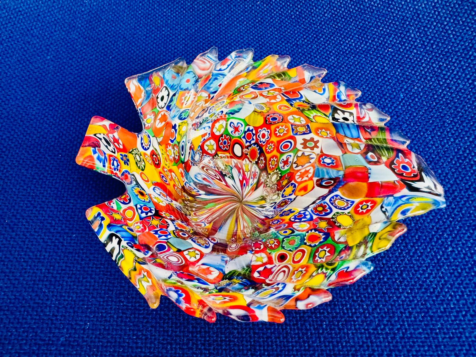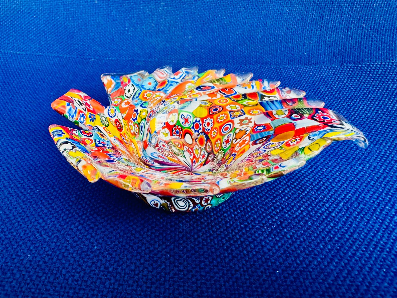 Es handelt sich um eine Schale aus Muranoglas, die mit der traditionellen italienischen Technik namens Millefiori hergestellt wurde. Der italienische Ausdruck -Millefiori- bedeutet übersetzt -tausend Blumen-.