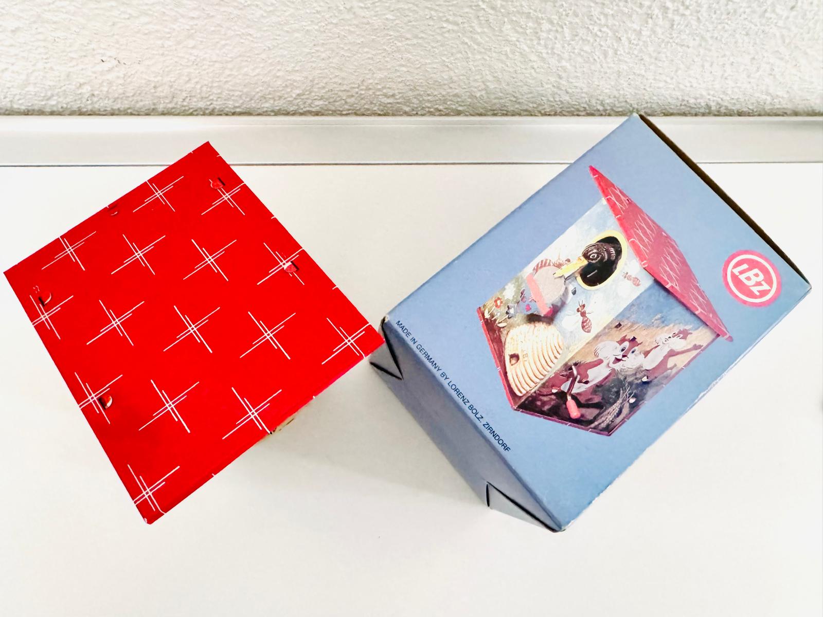 Neuwertige und unbespielte Mechanische Vogelhaus-Blechspardose Vintage LBZ (der Firma Lorenz Bolz, Zirndorf) West Germany mit OVP.
