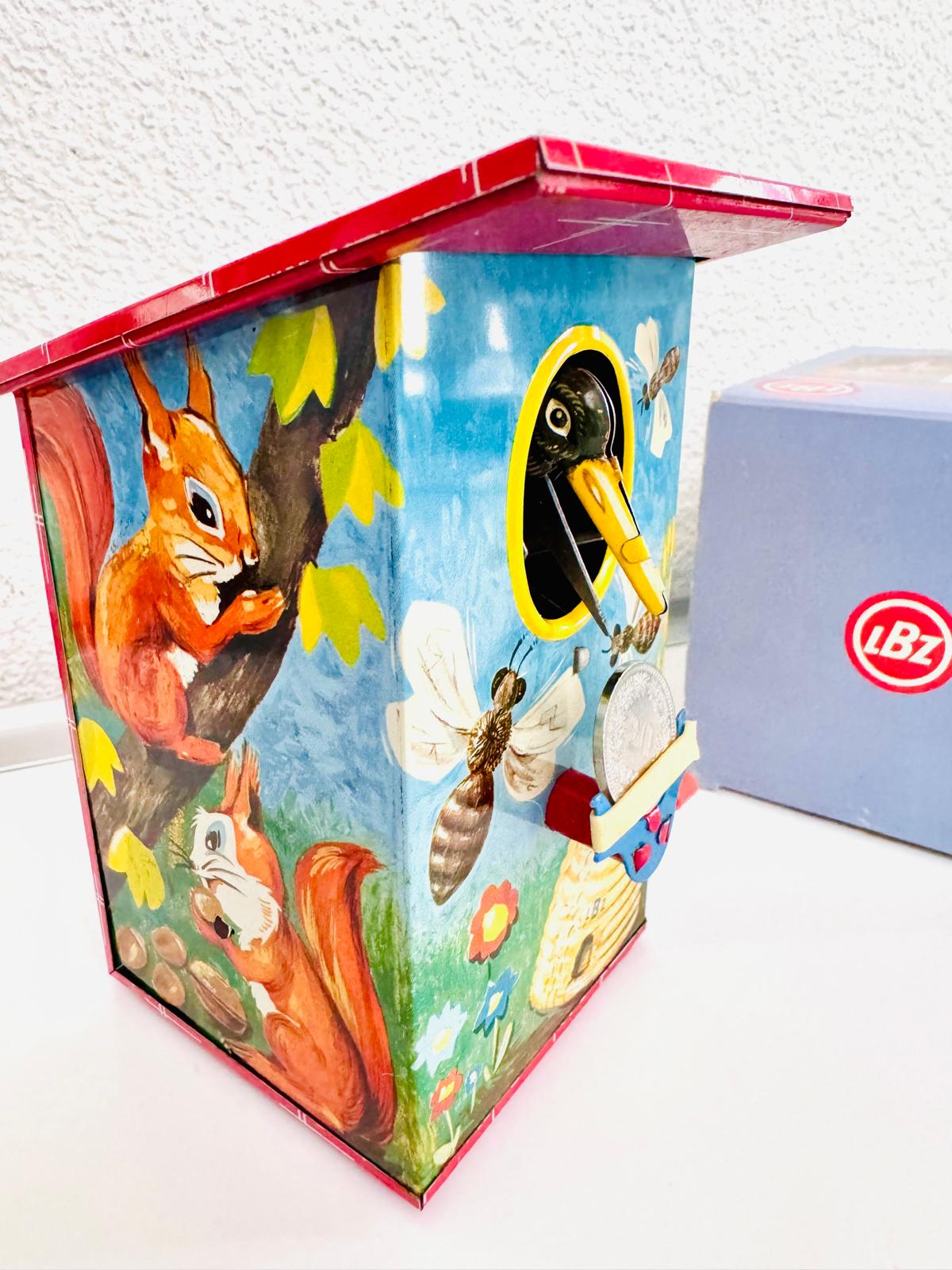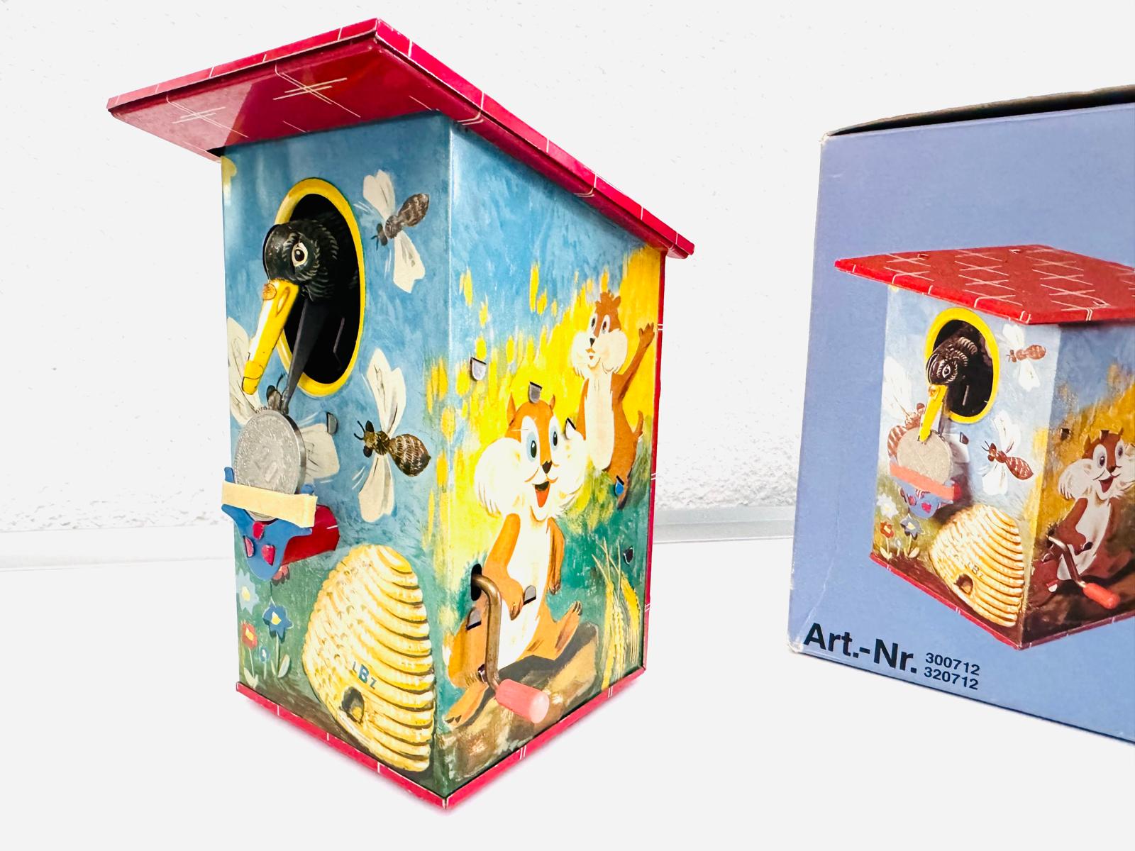 Mechanische Vogelhaus Spardose mit Bienen und Eichhörnchen Motiv. Niedliche Vintage Zinn Litho Vogelhaus Spardose. Kurbel arbeitet!
