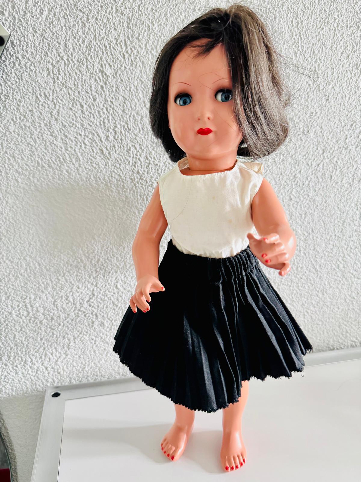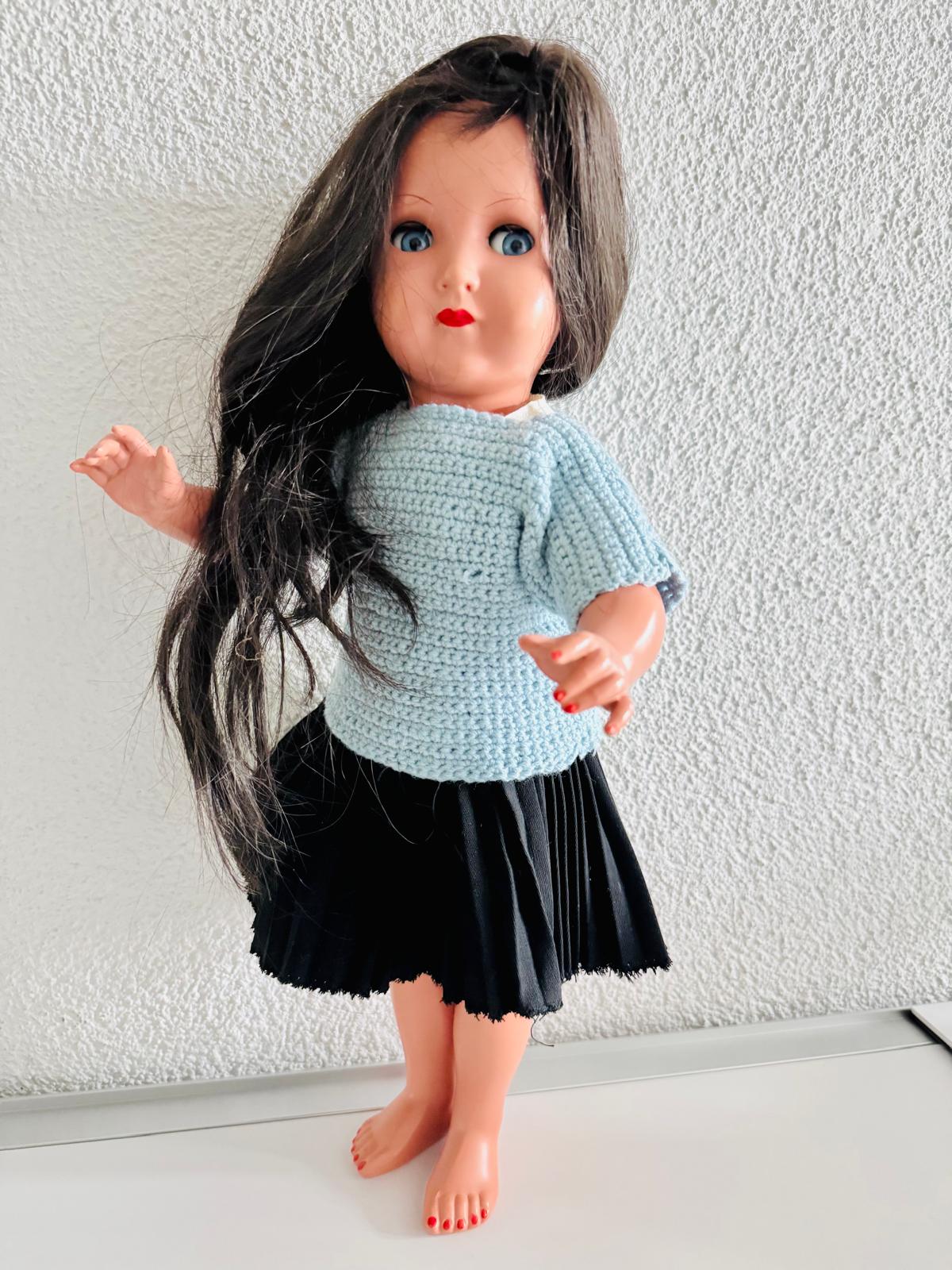 Angeboten wird eine alte Schildkröt Mädchen Puppe T46 namens Manuela, in sehr schönem Gebrauchtzustand inkl. 3 Kleidungsstücken (das hellblaue gestrickte Oberteil ist an der oberen Schulter rechts etwas eingerissen).